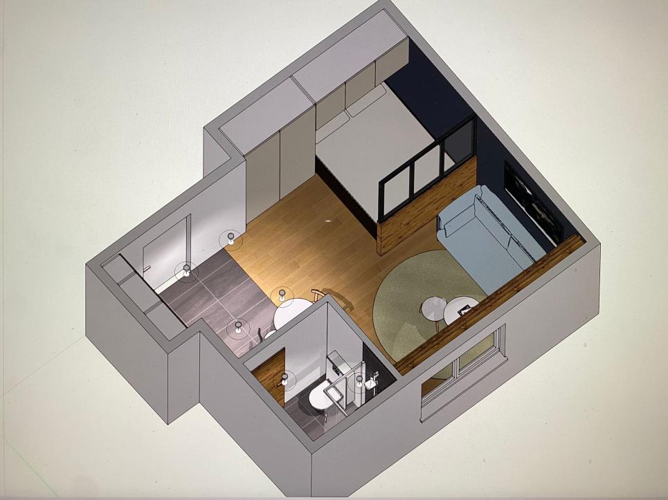 Il se compose d’un espace salon lumineux et accueillant, d’une cuisine ouverte entièrement aménagée et fonctionnelle, ainsi que d’une salle de douche moderne avec fenêtre.